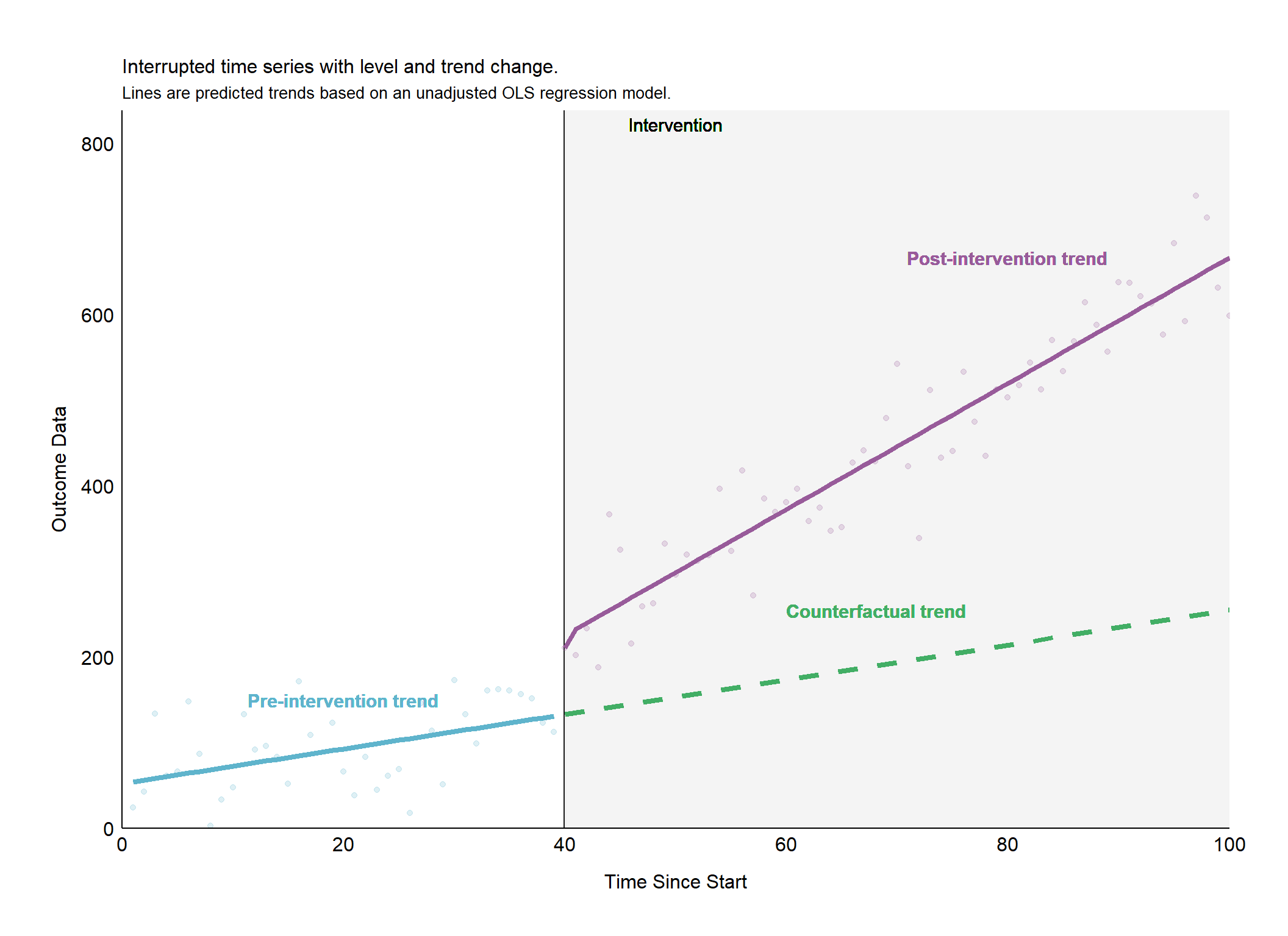 library(ggplot2)library(tidyverse)library(lubridate) library(tidymodels) # --- Parameters ----outcome_baseline <-50pre_intervention_slope <-2level_shift <-100trend_change <-5interv_point <-40n_timepoints <-100# --- Simulation ----set.seed(123) base_data <-tibble(time =1:n_timepoints,outcome = outcome_baseline + pre_intervention_slope * time +rnorm(n_timepoints, 0, 50))# --- Apply Intervention Effects ----df_its <- base_data %>%mutate(outcome =ifelse(time >= interv_point, outcome + level_shift + trend_change * (time - interv_point), outcome) ) %>% dplyr::mutate(immediate =ifelse(time == interv_point,1,0),step =ifelse(time >= interv_point,1,0),ramp =ifelse(time > interv_point,time -1,0), )# --- Build Counter Factual Data and Predictions ----counter_factual_data <-tibble(time = interv_point:n_timepoints,immediate =0,step =0,ramp =0 )# --- Build OLS Model ----its_ols_model <- stats::lm(outcome ~ time + immediate + step + ramp , data = df_its)# --- Predict Counter Factual Trend ----counterfactual_trend <-predict(its_ols_model, counter_factual_data)# --- Prepare Plotting Lines ----pre_intervention_line <-tibble(time =1:(interv_point-1),outcome = its_ols_model$fitted.values[1:(interv_point-1)])post_intervention_line <-tibble(time = interv_point:n_timepoints,outcome = its_ols_model$fitted.values[interv_point:n_timepoints])counterfactual_line <-tibble(time = counter_factual_data$time,outcome = counterfactual_trend ) %>%slice(c(1, n()))# --- Build the Plot ----ggplot(df_its, aes(x = time, y = outcome)) +# Intervention Markergeom_vline(xintercept = interv_point, size =1, color ="grey10") +geom_rect( aes(xmin = interv_point, xmax = n_timepoints, ymin =-Inf, ymax =+Inf),fill ='grey95', alpha =0.2) +geom_text(aes(x = interv_point +10, y =+Inf, label ="Intervention",vjust =1.5, hjust =0.5),size =4,color ="black") +# Pre and Post Intervention Pointsgeom_point(data =filter(df_its, time < interv_point), color ="#5fb4cc", alpha =0.2) +geom_point(data =filter(df_its, time >= interv_point), color ="#985b9a", alpha =0.2) +# Lines (combined pre, post, and counterfactual for conciseness)geom_line(data = pre_intervention_line, color ="#5fb4cc", linetype ="solid",linewidth =1.5) +geom_line(data = post_intervention_line, color ="#985b9a",linetype ="solid",linewidth =1.5) +geom_line(data = counterfactual_line, color ="#42ae65", linetype ="dashed", linewidth =1.5) +# Trend Labels (adjusted positions for visual clarity)geom_text(aes(x = interv_point /2, y = outcome_baseline *3, label ="Pre-intervention trend"), color ="#5fb4cc", size =4, fontface ="bold") +geom_text(aes(x = n_timepoints *0.8, y =tail(post_intervention_line$outcome, 1), label ="Post-intervention trend"), color ="#985b9a", size =4, fontface ="bold") +geom_text(aes(x = n_timepoints *0.6, y =tail(counterfactual_line$outcome, 1),label ="Counterfactual trend"), color ="#42ae65", size =4, fontface ="bold", hjust =0) +# Theme customizationtheme_classic() +theme(# White background areaspanel.background =element_rect(fill ="white"),plot.background =element_rect(fill ="white"),plot.margin =unit(c(0.5, 0.5, 0.5, 0.5), "inches"),# Plot marginsplot.title =element_text(size =12,color ="black"),plot.subtitle =element_text(size =10,color ="black"),axis.title.y =element_text(size =12,color ="black", vjust =3),axis.title.x =element_text(size =12,color ="black", vjust =-3),axis.text =element_text(color ="black",size =12),# Remove axis ticksaxis.ticks =element_blank(),legend.position ="none" ) +ggtitle("Interrupted time series with level and trend change.", subtitle ="Lines are predicted trends based on an unadjusted OLS regression model.") +ylab("Outcome Data") +xlab("Time Since Start") +scale_y_continuous(expand =c(0, 0),breaks = scales::pretty_breaks(), limits =c(0,max(df_its$outcome)+100)) +scale_x_continuous(expand =c(0, 0),breaks = scales::pretty_breaks(), limits =c(0,n_timepoints))